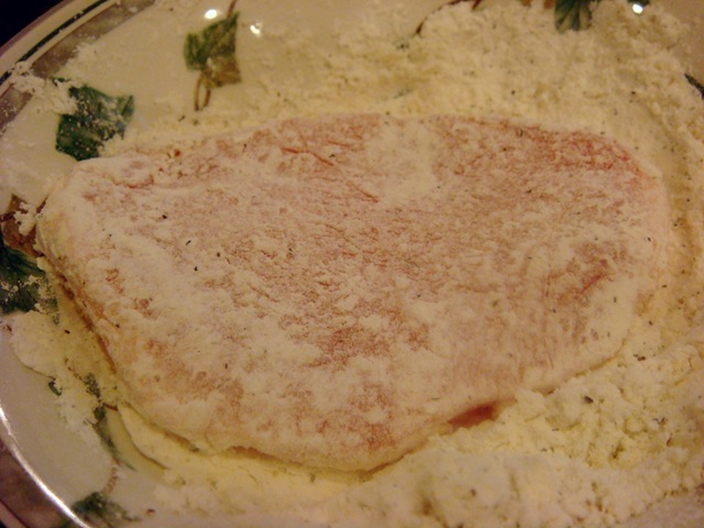 Season flour with a small amount of salt and pepper and place in a small bowl. Put beaten egg and breadcrumbs in two additional bowls.