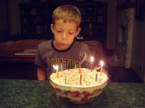Last week was a week of highs and lows for our Little A. After contracting Lyme disease last month (and a long month before a definitive diagnosis), he had some unexpected complications on Monday which landed us in Children’s Hospital for the next few days. He was released just in time to celebrate his 9th birthday on Friday: a day full of Pirates baseball (GO BUCS! Who are not only over 500 for the first time in almost 20 years, but are leading their division!) and a family celebration with one of Little A’s favorite desserts: English Trifle. A birthday party with friends on Saturday helped to erase the not-so-fun start to the week.