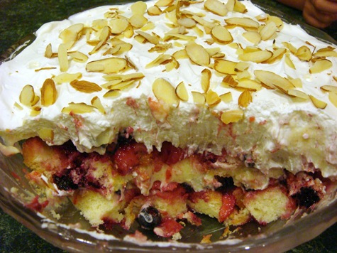 Layer half of the cake slices, fruit and custard in a large glass serving bowl. Repeat layers. Whip cream with powdered sugar/Stevia and almond extract. Spread on top of the trifle layers. Cover with plastic wrap and refrigerate until serving time. Just before serving, sprinkle with toasted almonds.