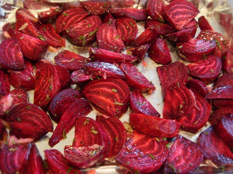 Cut beets into wedges (each beet should make 8 wedges). In a large bowl, stir together beet wedges, minced rosemary, sliced garlic and olive oil. Grind in some fresh salt and pepper and toss to coat.