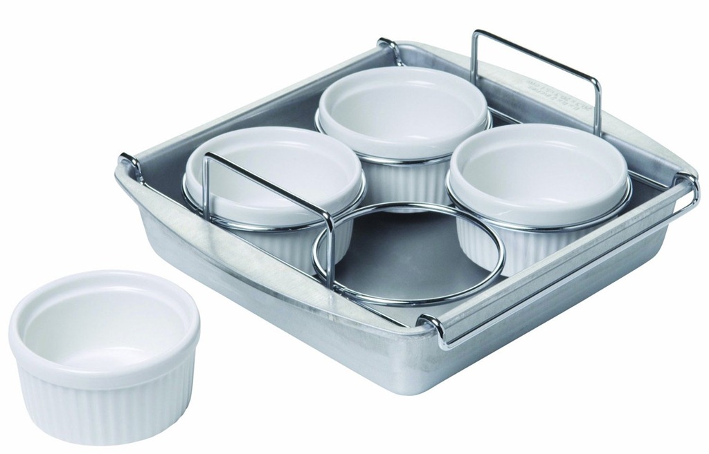 While this is definitely not a necessary kitchen item (it was a gift), I do enjoy using it. I like that the rack keeps the bottom of the ramekins from touching the bottom of the pan when using a water bath. And it is really easy to remove the ramekins from the water bath with the rack. However. With 8 little cups and 6 people in our house right now, this creates conflict regarding the two “extras”.
