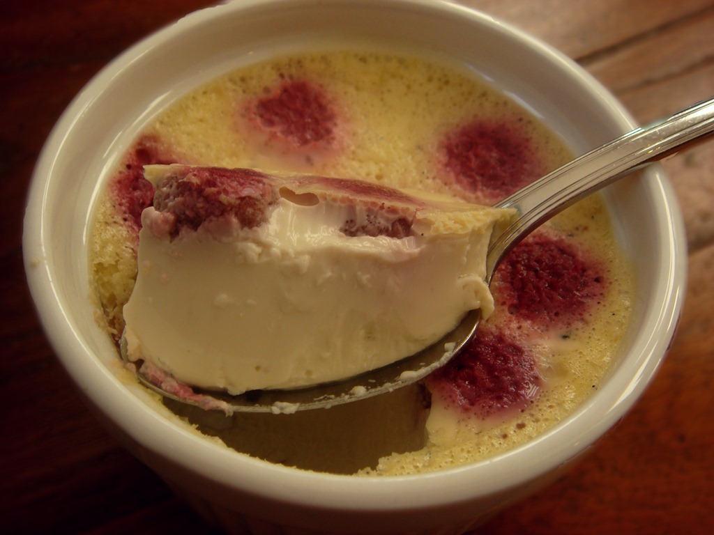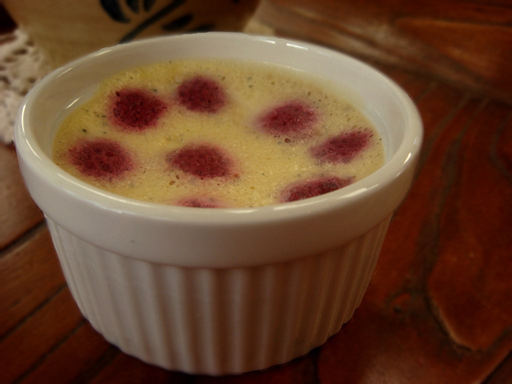 Place 5-6 raspberries (if using frozen raspberries, do not thaw first) in the bottom of each ramekin. Pour custard over raspberries. Fill bottom of larger pan with enough hot, almost boiling, water to come halfway up sides of ramekins.