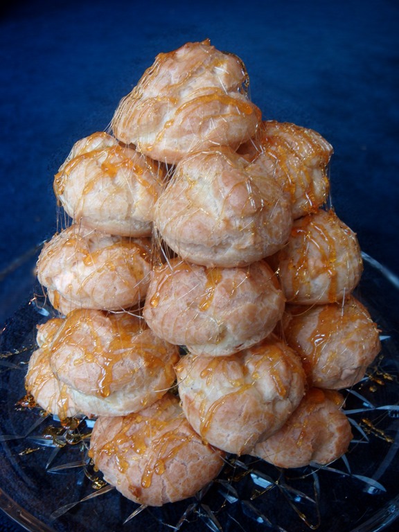 Place one layer of cream puffs in a circle on a serving plate. Drizzle the tops of the cream puffs with a small amount of the burnt  caramel. Immediately place a smaller circle of cream puffs on top of the hot caramel (work quickly before the caramel hardens). Repeat with increasingly smaller layers of cream puffs topped with caramel. Once your tower is assembled, use a spoon or fork to drizzle hot caramel in strands around the outside of the tower. Serve same day as assembling.