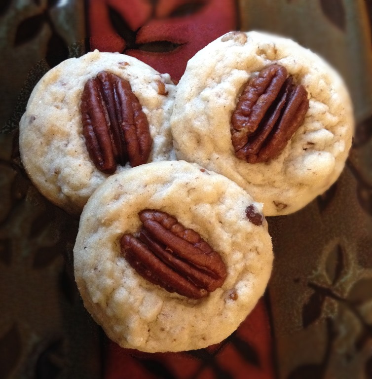 Use a SMALL cookie scoop to make rounded balls (about 2 tsp dough). Place on ungreased cookie sheets. Press 1 whole pecan into the top of each dough ball. Bake for 8-9 minutes.