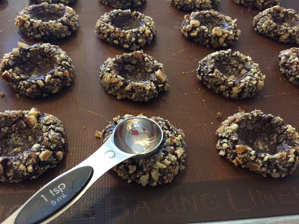 Preheat oven to 350°F. Place egg whites in a small bowl. Place finely chopped pecans in a bowl. Set aside. Roll dough into balls. Dip balls into egg white and then into pecans. (I find this easier if I make a whole baking sheet worth of dough balls, then dip them in egg/pecans). Place on a parchment paper lined baking sheet. Make a small indentation in the center of each cookie with the back of measuring spoon (I use a ½ teaspoon) or your thumb.