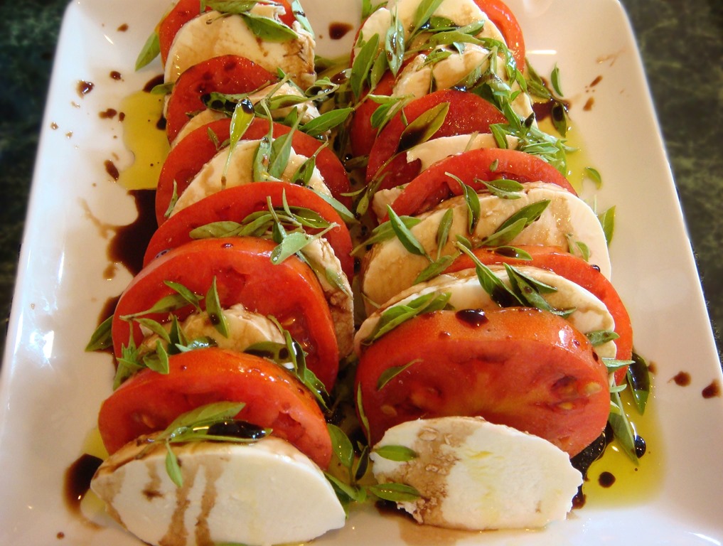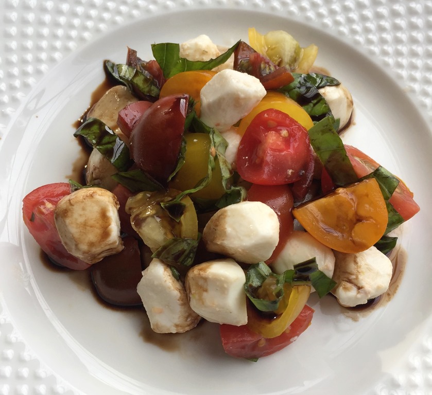 A Caprese Salad is the perfect accompaniment to grilled summer meats: chicken, steaks, pork, even hamburgers. Made with summer fresh tomatoes and basil, fresh mozzarella, and a reduced balsamic glaze, it just screams summer and healthy eating.