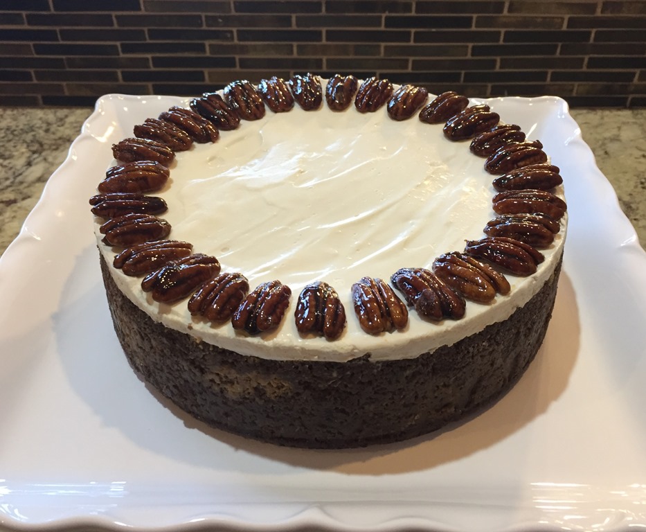 Just before serving, arrange candied pecans around the outside edge of cheesecake.