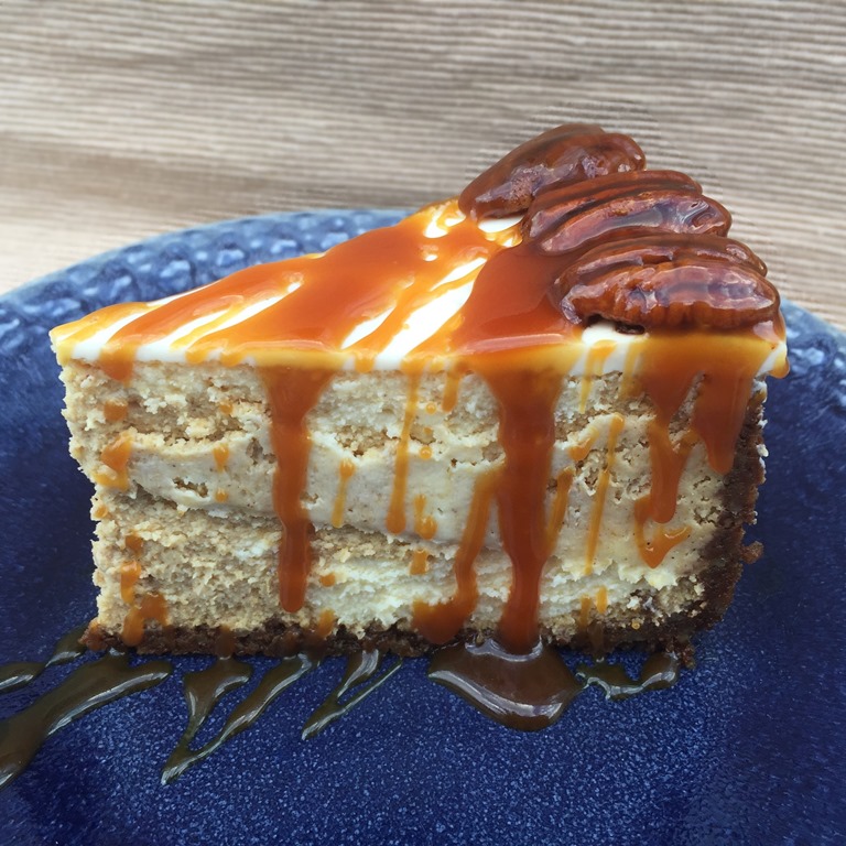 To send it over the top, the cheesecake is garnished with candied pecans and then salted caramel is drizzled over individual slices. Even my cheesecake-averse daughter asked for this to show up on the Thanksgiving menu again this year.