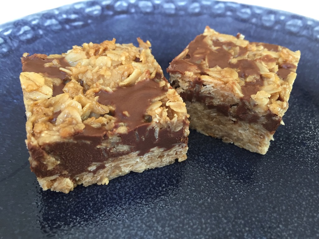 Press 2/3 of the oat mixture into the prepared pan. Pour the chocolate/peanut butter mixture over the crust. Dot remaining oat mixture over the chocolate layer, pressing gently.