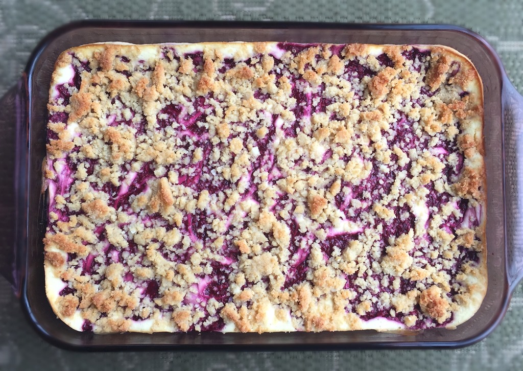 Topping: Crumble the remaining crust mixture over the top of the fruit/cheesecake mixture.