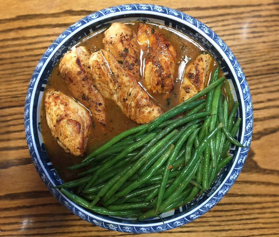 This is a quick one-skillet meal that can be made in less than 30 minutes. Chicken and fresh green beans in a slightly spicy lemon sauce.
