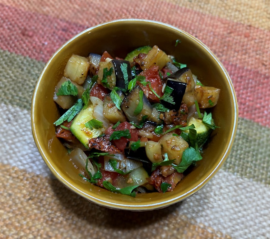 My kids call this Indian Ratatouille. It is a perfect accompaniment to grilled meats.