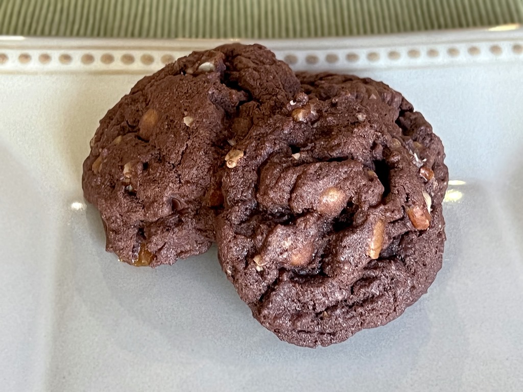This is a basic chocolate drop cookie dough with chocolate chips, caramel pieces, and chopped pecans mixed in.
