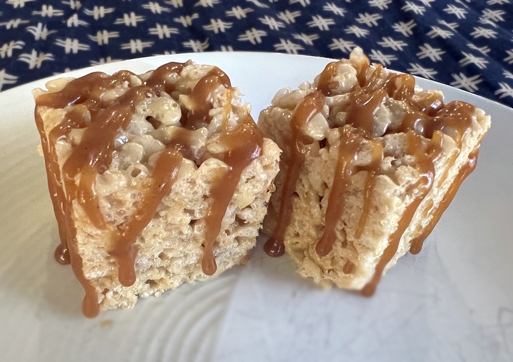 Looking to take your Rice Krispies Treats to the next level? This recipe fits that bill perfectly. I adjusted the original recipe to use an entire box of Rice Krispies (since we don’t have any cereal eaters left at home), which makes them extra thick. The addition of salted caramel to the mix adds a rich delicious flavor.