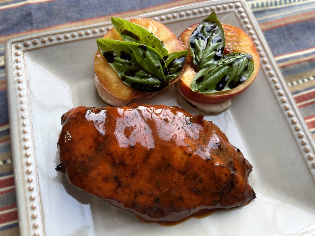 Grilled dry rub chicken, then glazed with a spicy hot sauce. I paired this grilled chicken with a sweet Peach Caprese Salad, which offered a nice contrast to the spicy chicken.