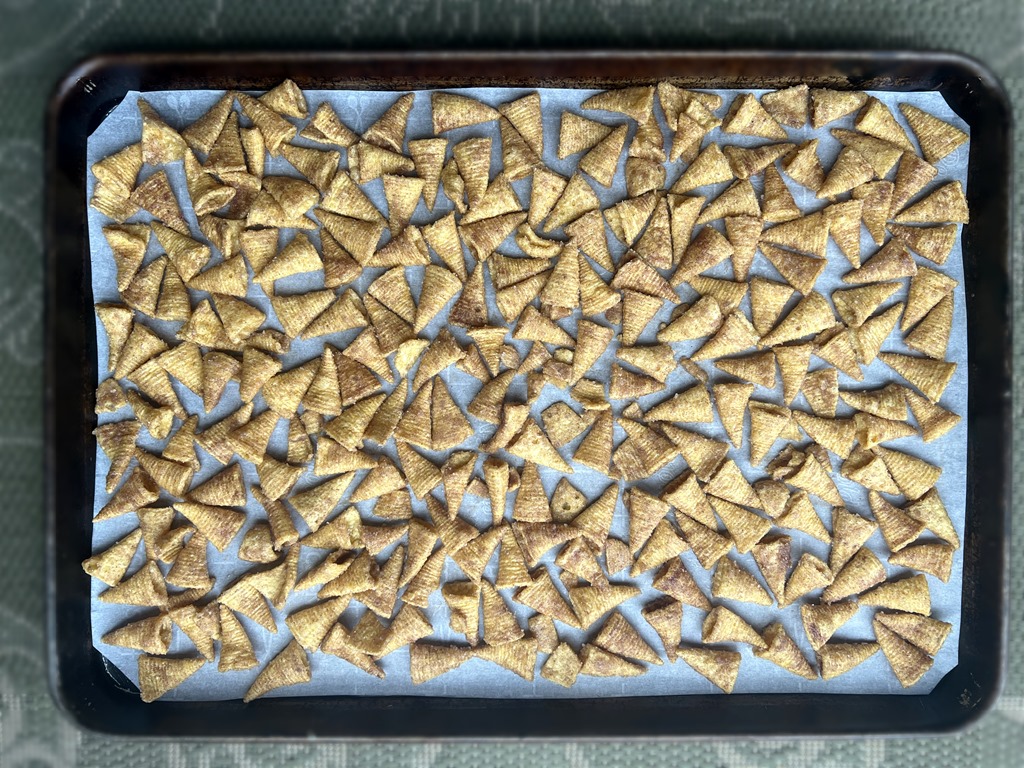 Spread Bugle mixture in a single layer on prepared baking sheet. Bake for 4 minutes. Stir. Bake for an additional 4 minutes. Remove from oven and stir again immediately.