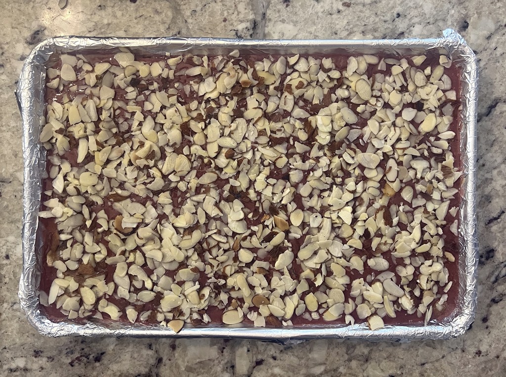 While crust is cooking, prepare topping. In a medium bowl, stir together melted butter, sugar, jam, vanilla, and beaten egg. Spread topping evenly over HOT crust. Sprinkle with sliced almonds.