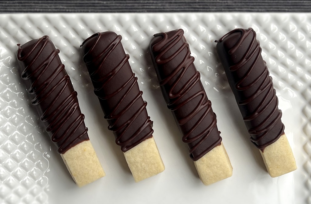 Delicious orange shortbread sticks coated in dark chocolate.