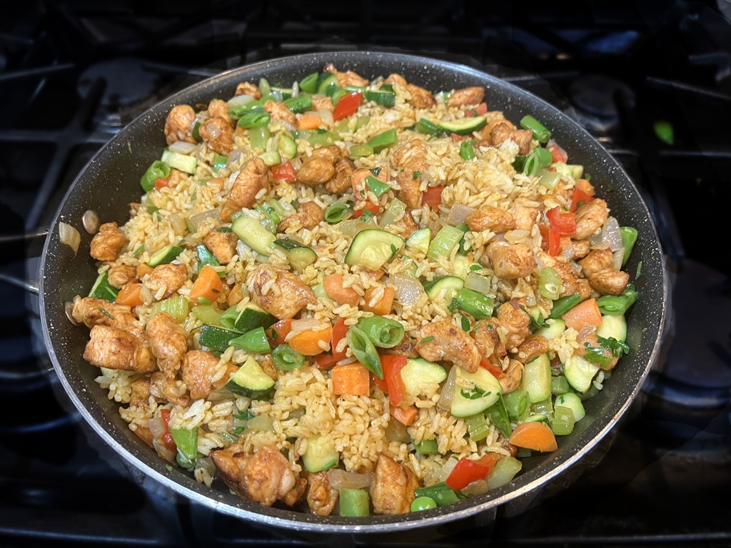 An Indian rice dish that is completely adaptable to any protein and vegetable combination you have on hand. Made here with chicken, zucchini, snap peas, red pepper, carrots, and onion.