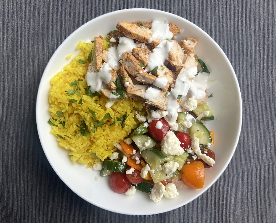 Marinated, grilled Mediterranean Chicken Shawarma, served in bowls with Lemon Turmeric Rice (made in an Instant Pot, if desired), a fresh Greek cucumber and tomato salad garnished with feta, and drizzled with a tangy garlic sauce.