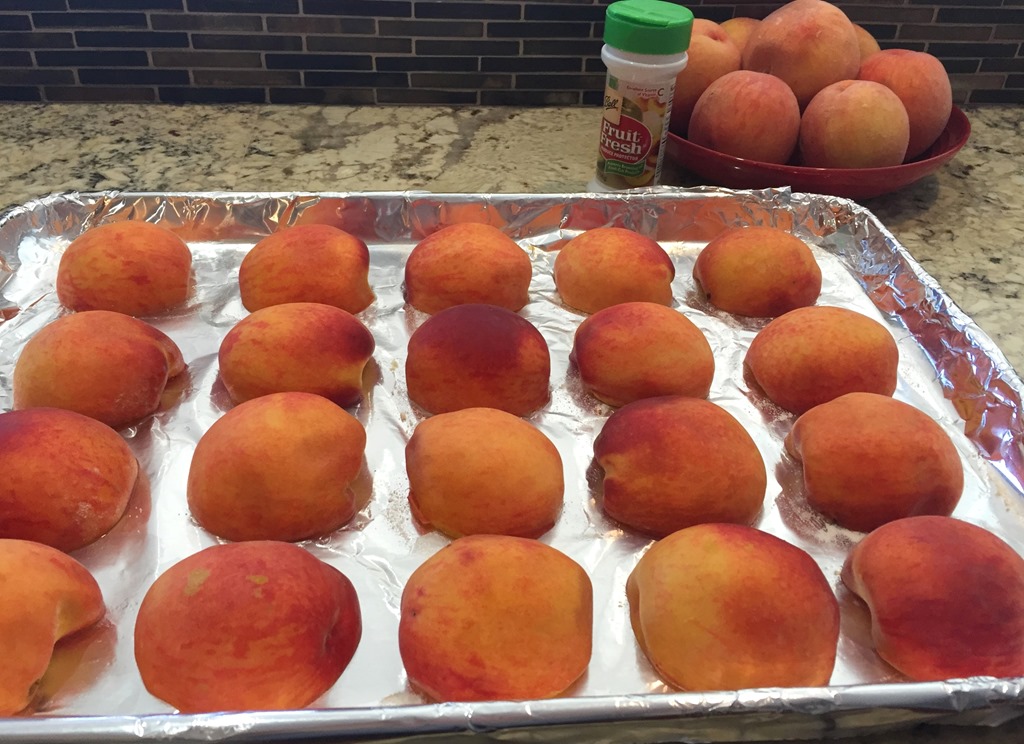 To prepare peaches for freezing: wash peaches, cut in half and remove pit, place cut side up on a foil-lined tray, sprinkle with Fruit Fresh, turn cut side down, and place in freezer. When peach halves are solid, place in Ziploc bags and return to the freezer.