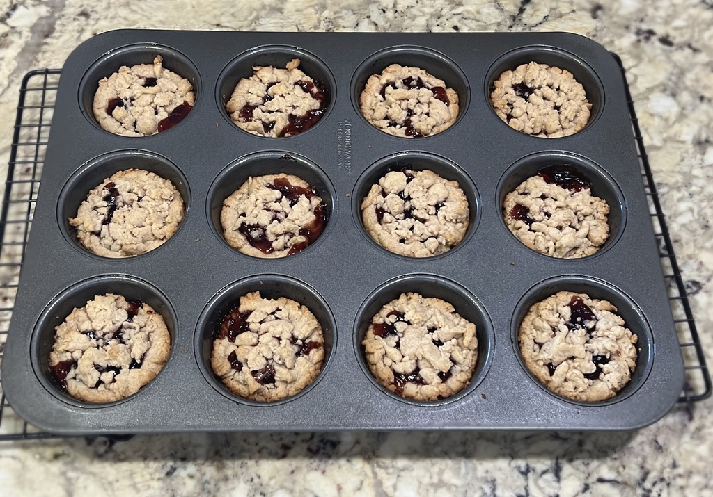 Raspberry filled cookies with a crumbly shortbread crust and topping, baked in a muffin tin.