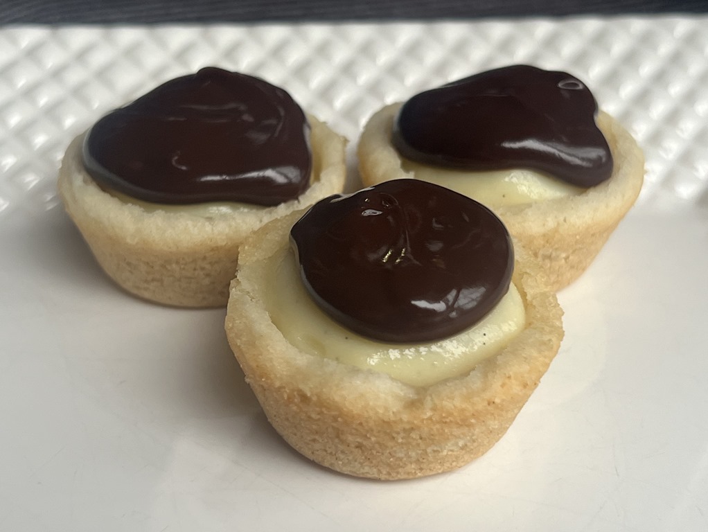A shortbread cookie cup filled with homemade vanilla custard and topped with chocolate ganache.