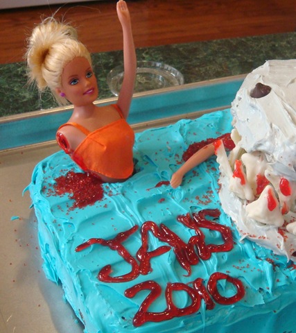 A quick break from Thanksgiving Recipes to bring you Jaws 2010. Three creative young bakers put together this fabulous 3-D Jaws Cake (complete with dismembered Barbie) for a Retro Jaws Party last night.