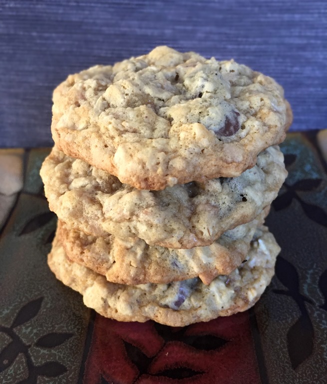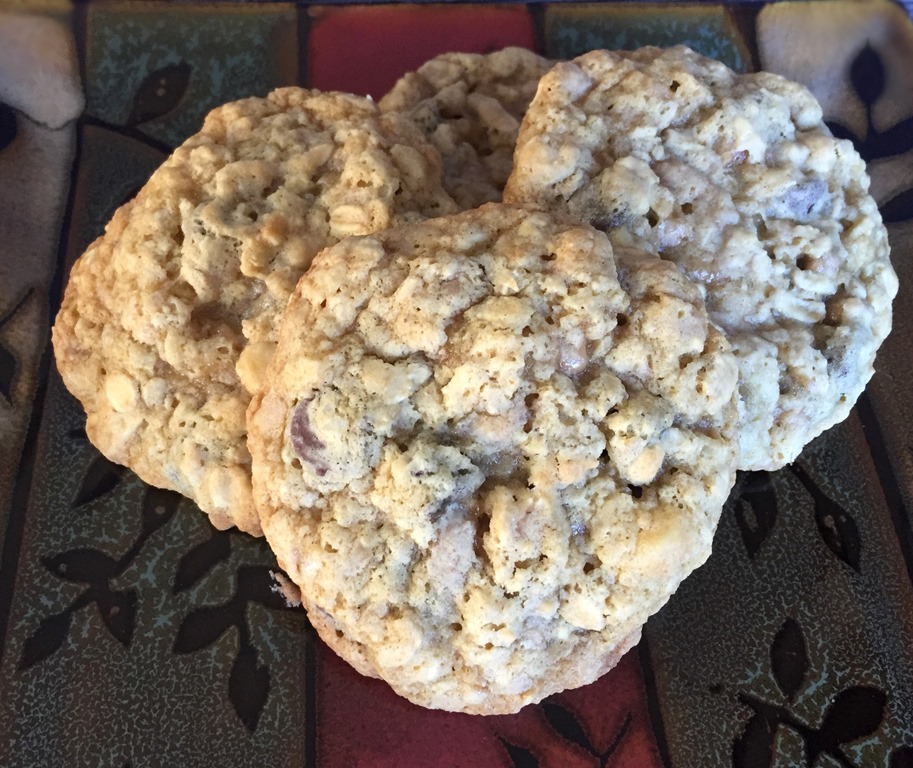 In a small mixing bowl, whisk together flour, baking soda, and salt. Gradually beat into butter/sugar mixture, until just mixed. Beat in oats, crushed cereal, chocolate chips, coconut, and walnuts.