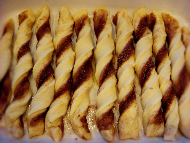 Divide dough into two halves. On a lightly buttered surface, pat each dough half into a rectangle about 12”x18”. Spread ½ stick of butter (¼ cup) on each dough half and sprinkle with half of the sugar/cinnamon mixture. Starting from long edge, form a roll. Pinch long edge to seal. Use a knife to lightly score dough into 18 sections about 1” apart. Place a strand of dental floss under the dough and cross over the top of the dough at the scored marking. Pull dental floss to cut through dough log. Place in prepared pan. Cover with a thin towel and allow rolls to rise in a warm place for 45-60 minutes.