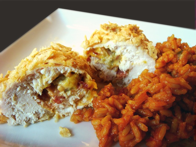 Spread the filling on the flattened chicken breasts and roll, beginning with the smallest end. Secure with toothpicks, if necessary. Dip chicken breasts in beaten egg and then a combination of Parmesan cheese and crushed tortilla chips.