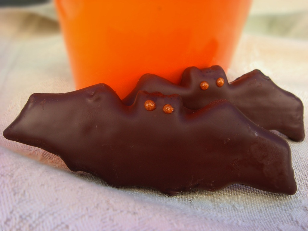 Melt chocolate in a heatproof bowl in the microwave or in a double boiler (melt chocolate slowly). Dunk cookies into melted chocolate. Use a fork to turn the cookie over in the chocolate. Pick up the cookie with the fork, let excess chocolate drip off, and gently scrape bottom against edge of bowl. Place on parchment (or waxed paper)-lined baking sheets. Let chocolate harden. (TIME SAVING NOTE: You can also just use your fingers to hold the cookie and only dunk the top and sides of the cookie, gently scraping the excess chocolate off of the top of the cookie before placing it on the parchment paper) To make eyes, place melted candy coating in a Ziploc or pastry bag. Poke a small hole in the end with a toothpick and pipe eyes onto bats.