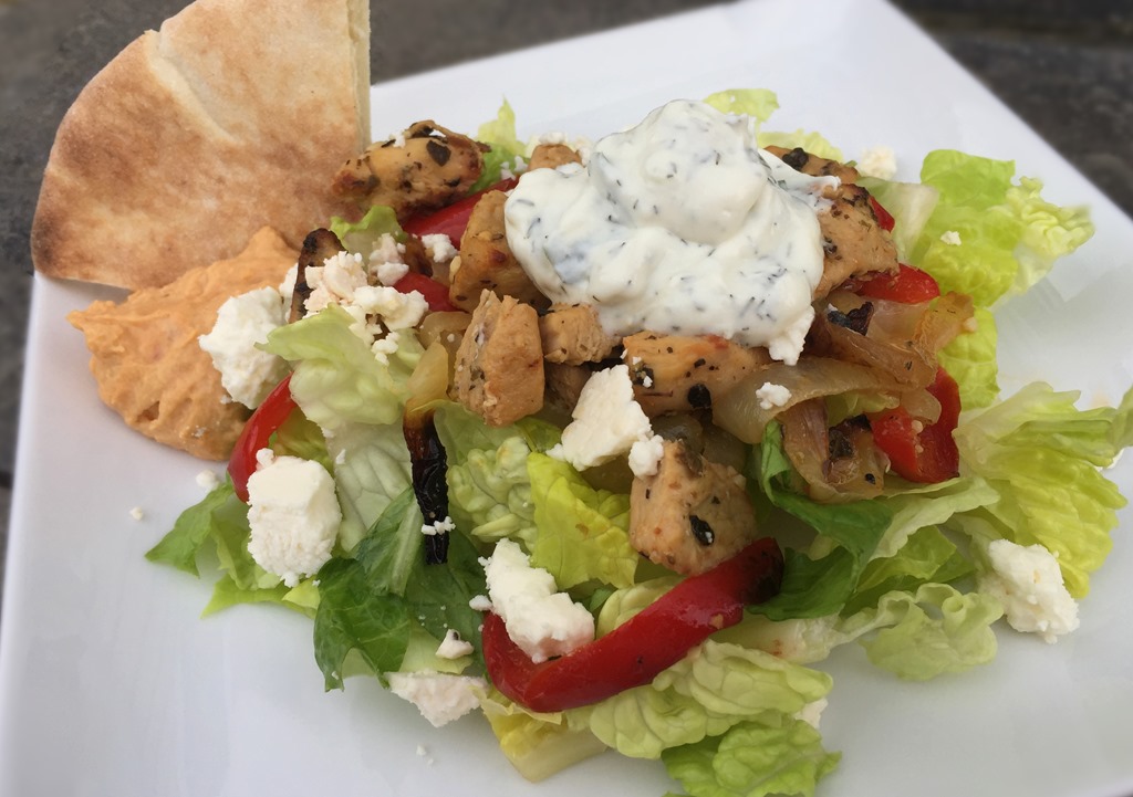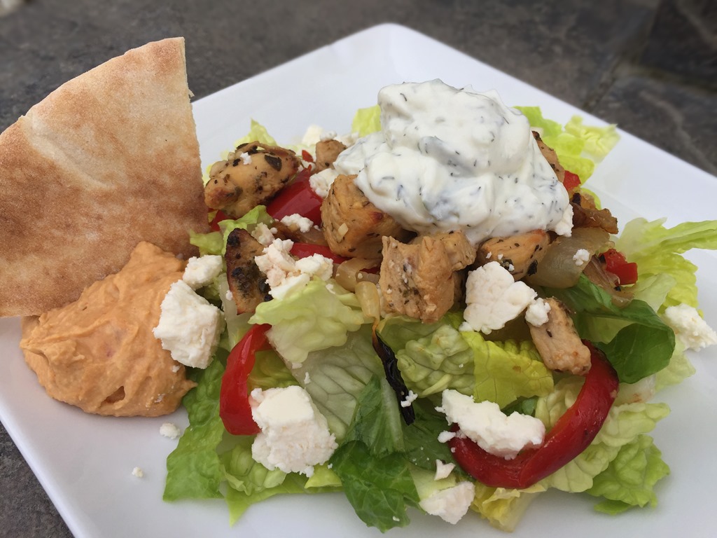 Serve over lettuce with feta cheese, tzatziki, hummus and pita bread wedges. Chicken can also be eaten inside of pitas with hummus, tzatziki and feta cheese.
