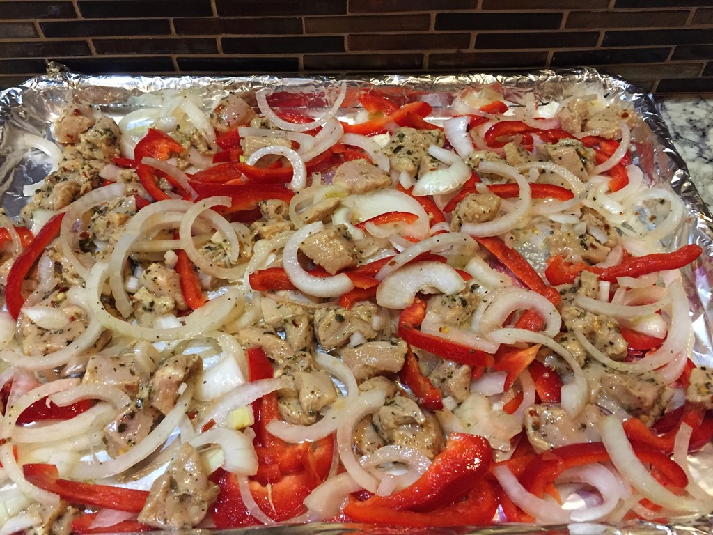 I like to roast the chicken, peppers and onions in the oven to get nice crispy charred edges, but you could also cook them in a skillet.