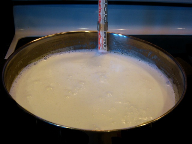 In a saucepot, stir together milk and dry milk powder. If you are using a thermometer, attach it to the side of the pan and bring milk to 185°F-200°F, stirring often. If you are not using a thermometer, bring milk just barely to a boil and then remove from heat immediately. If the milk has developed a foam on top, skim this off.