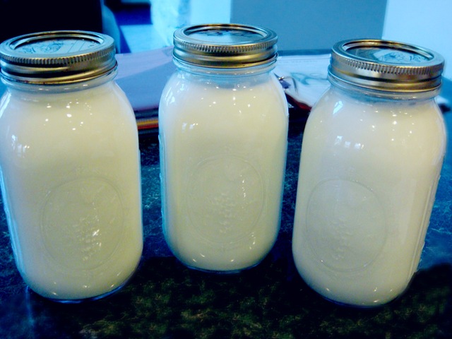 Some of my children find this disgusting, and refuse to touch anything in the fridge that is kept in a Mason Jar. Others have jumped right in and love to drink our daily kefir smoothies, or eat “stirring yogurt” (Little J’s name for homemade yogurt-because you get to “stir-in” whatever flavor or additives you want-like the granola recipe at the bottom of the page). Kefir is my sour-milk of choice, but a nice thick yogurt is always great to have around as well. I will show you some of my kefir-growing soon, but if you are new to kefir check out this great website.