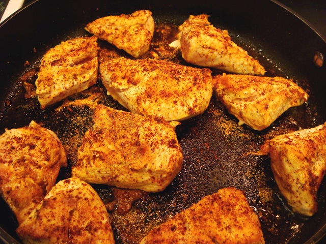 Simply brown some chicken breasts (generously seasoning with garlic powder, cumin, and chili powder).