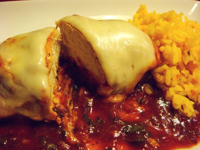 Just before serving, top each chicken piece with a slice of cheese. Cover and let cheese just begin to melt. Serve over rice (our favorite is Vigo brand “Yellow Rice”, a Spanish saffron flavored rice).