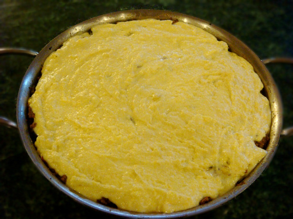 Spread the cornbread batter over the hot filling in the skillet. Bake at 375°F for about 30 minutes, or until cornbread is cooked through and lightly browned. (Exact cooking time will depend on the diameter of your baking dish. If the top of the cornbread is brown, but center is not set, cover with foil and continue to cook until set). Top with cheese. Cook 5 additional minutes. Remove from oven and let cool for 5 minutes before serving.