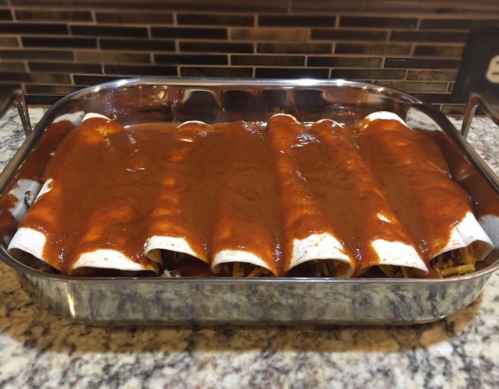 Spread about ½ cup of Enchilada Sauce on bottom of baking dish. Place about 1/3 cup (for corn tortillas) – ½ cup (for flour tortillas) down the center of each tortilla. Top with shredded cheese. Wrap the tortilla around the filling and place seam-side down in the baking pan. Pour remaining Enchilada Sauce over filled enchiladas.