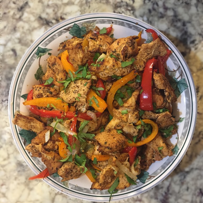 Roast in oven for 10 minutes. Pour off any liquid in the pan. Set oven to broil and cook until chicken and peppers just begin to char. Remove from oven and sprinkle with remaining 2 Tbs cilantro.