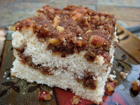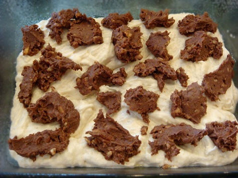Spread half of the batter in a well-greased 9 x 13” baking pan (I used baking spray with flour). Sprinkle with half of the topping. Spread remaining batter into pan; sprinkle with remaining topping.