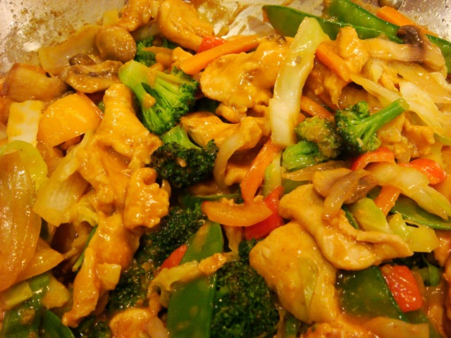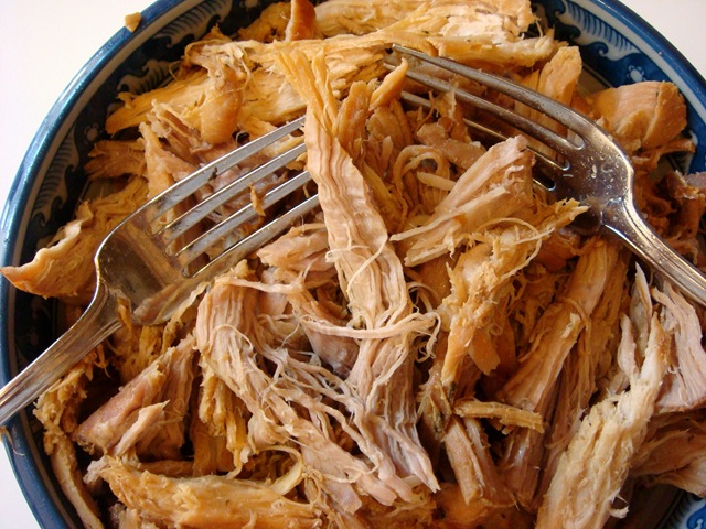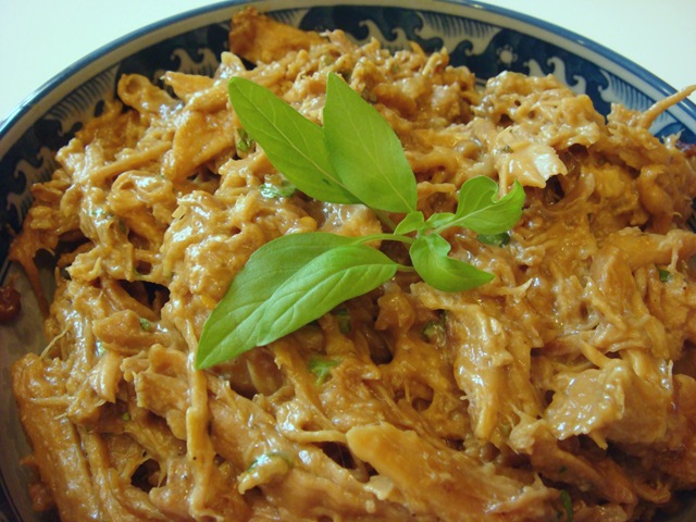 Remove the pork roast from the crock pot and shred with forks. Stir some peanut butter (either creamy or chunky) into the sauce in the crock pot. Return pork to crock pot and mix into sauce. Stir in some Thai basil (cilantro also adds a nice flavor, if you don’t have Thai basil).
