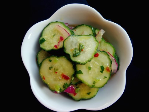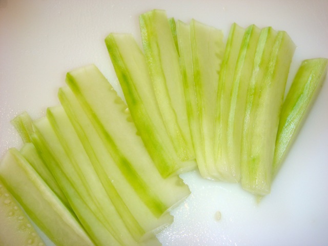 For the cucumber, I use a seedless cucumber and slice it into wide julienned strips. Peel and slice cucumber in half crosswise (giving you 2 cylinders). Cut in half again lengthwise. Slice each piece lengthwise into very thin strips (they should resemble long rectangles, not half-circles).