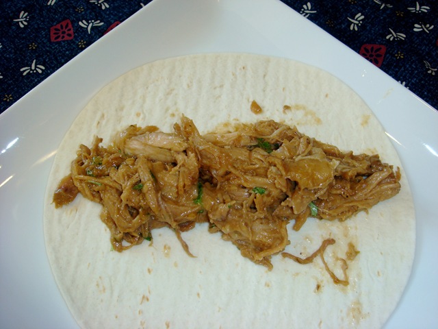 Cooked and shredded pork in a slightly spicy peanut sauce, topped with crisp, cool cucumber slices and lettuce. Sprinkle with some chopped peanuts and an Asian dressing, and roll the whole thing up in a tortilla (or use whole lettuce leaves for a twist on the traditional lettuce wrap).