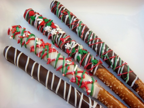 Melt chocolates using a double boiler (or melt slowly in the microwave). For easy dipping, pour chocolate into a tall narrow container, like a drinking glass, wide mouthed canning jar, or a Pyrex measuring cup. (For easy cleanup, line your glass or jar with a Ziploc bag. Fold the top edge of the bag back over the lip of the cup) Use a spoon, if needed to coat about 2/3 of the pretzel rod with the chocolate.