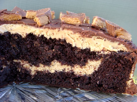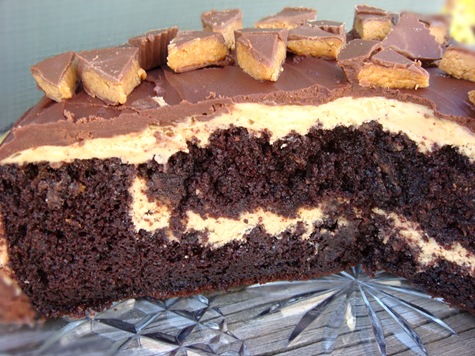 Prepare cake mix batter as directed on box (or use your favorite recipe). Stir the coarsely chopped peanut butter cups into the cake batter (reserve the second half of the peanut butter cups to garnish the top). Pour entire batter into one 10” round cake pan. (This is larger than a standard cake pan. If you want to use a standard sized pan, make 3-4 cupcakes out of the batter then pour the remaining batter into the pan. It will overflow if you use all of the batter in a standard pan). Bake cake for 40-45 minutes, or until center is set. Cool cake in pan for 10 minutes, then invert cake onto a wire rack to cool completely.