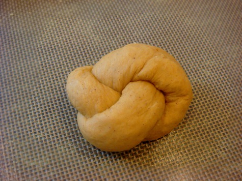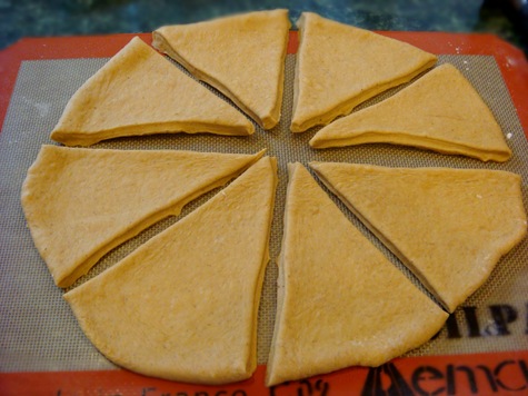 Roll each dough ball into a circle and cut into 12 wedges. Cut a ½” slit in the wide end of the wedge, separate slightly and roll into crescent shape and place on prepared pans.