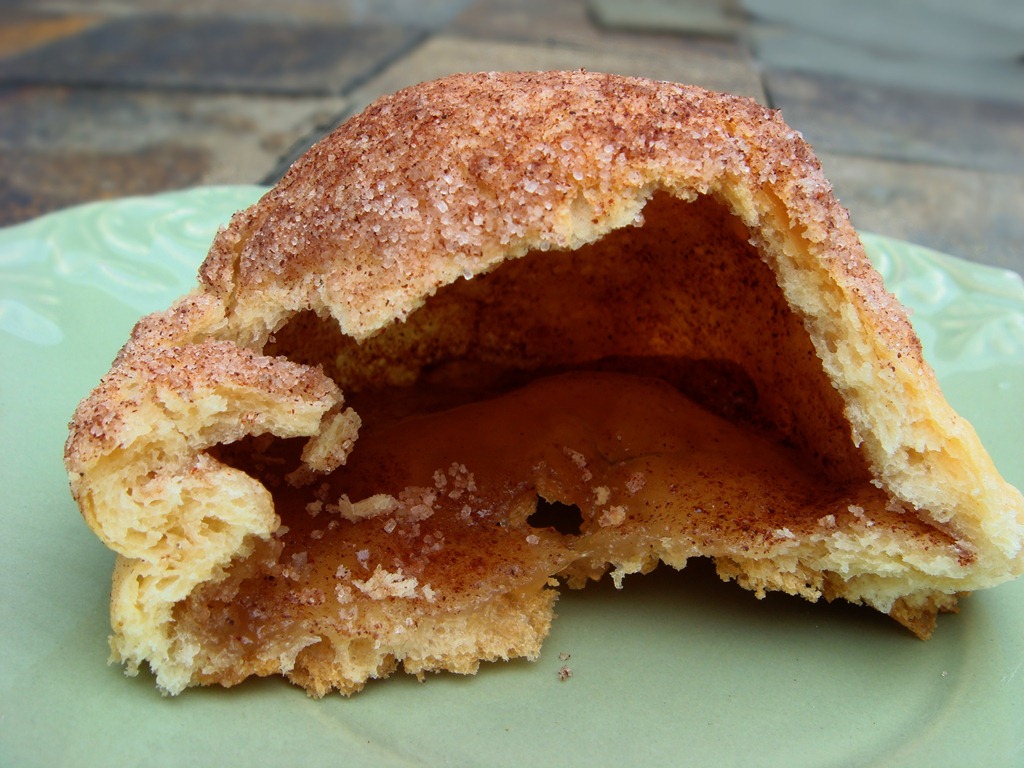 To help elongate the crescent rolls and keep them from being too thick in the center, I cut a slit in the wide edge, separate the slit slightly, and then roll the dough into a crescent shape.