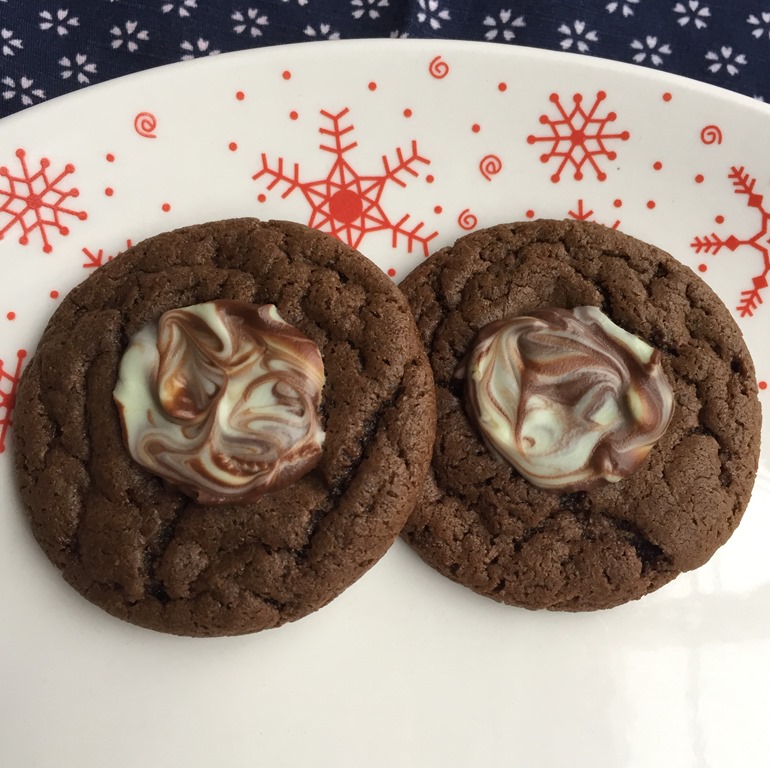The Andes Cookies have a melted Andes mint swirled on the top of a baked chocolate cookie.